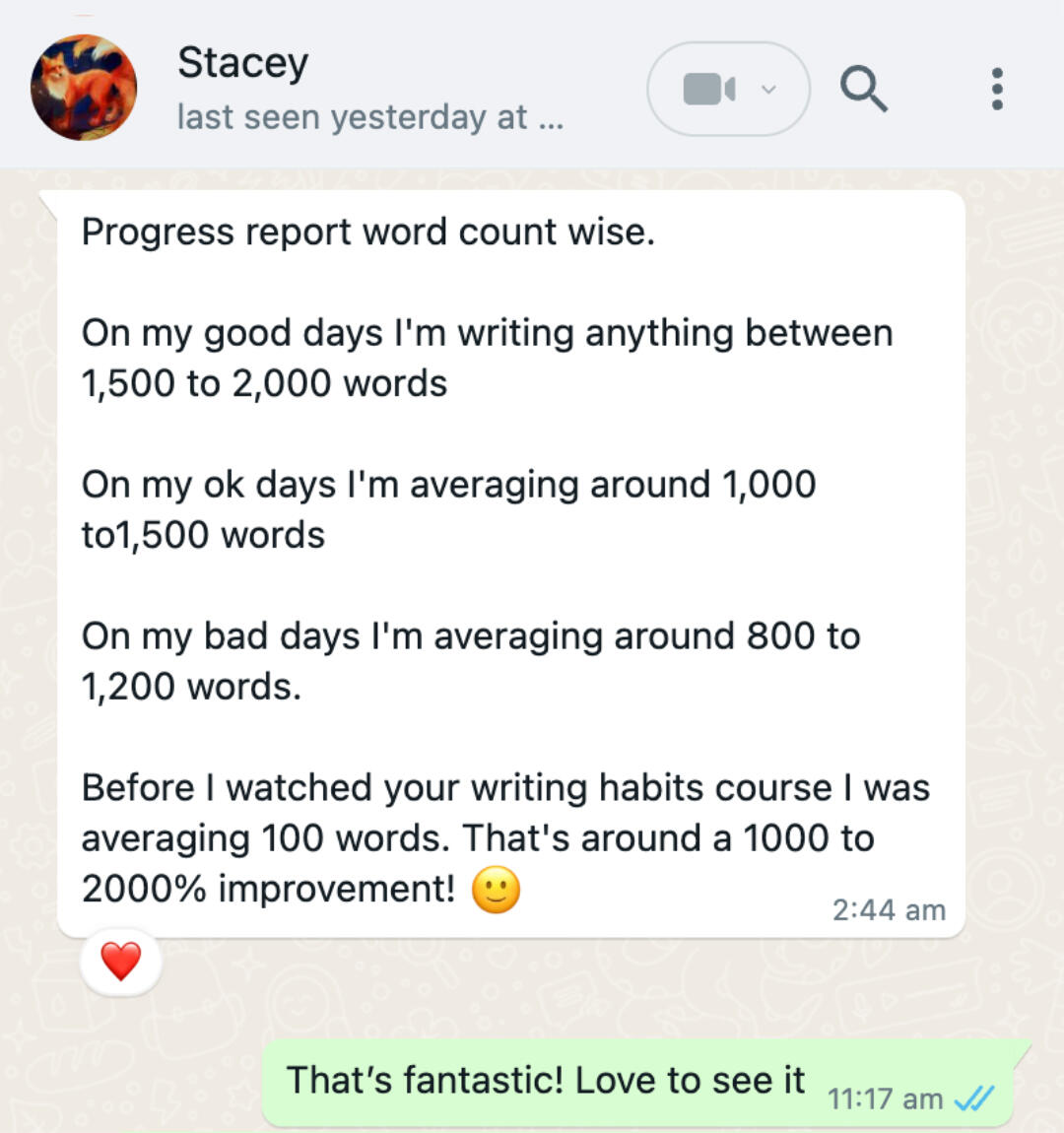 Fast forward to today, and I’ve written over a million words.Thanks to the system I’ve developed, I know that I can consistently finish quality novels that readers love.I know that I can take the ideas and the stories in my head - and I can unleash them onto the page.This is all because I’ve developed writing and editing habits that are consistent, sustainable, and enjoyable.And now, I want to help you do the same.